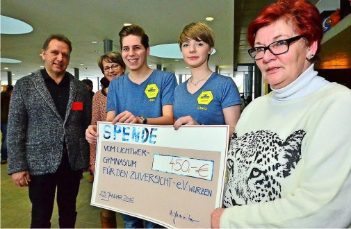 Schülerräten Clara und Alex einen Scheck an Veronika Findeisen (r.) vom Zuversicht-Verein.