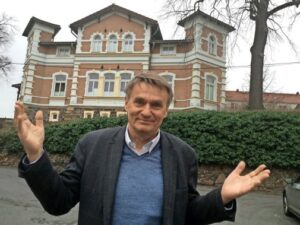 Joachim Brand (65) ist Eigentümer der Wurzener Filzfabrik. Im Hintergrund die sogenannte Villa auf dem Werksgelände.